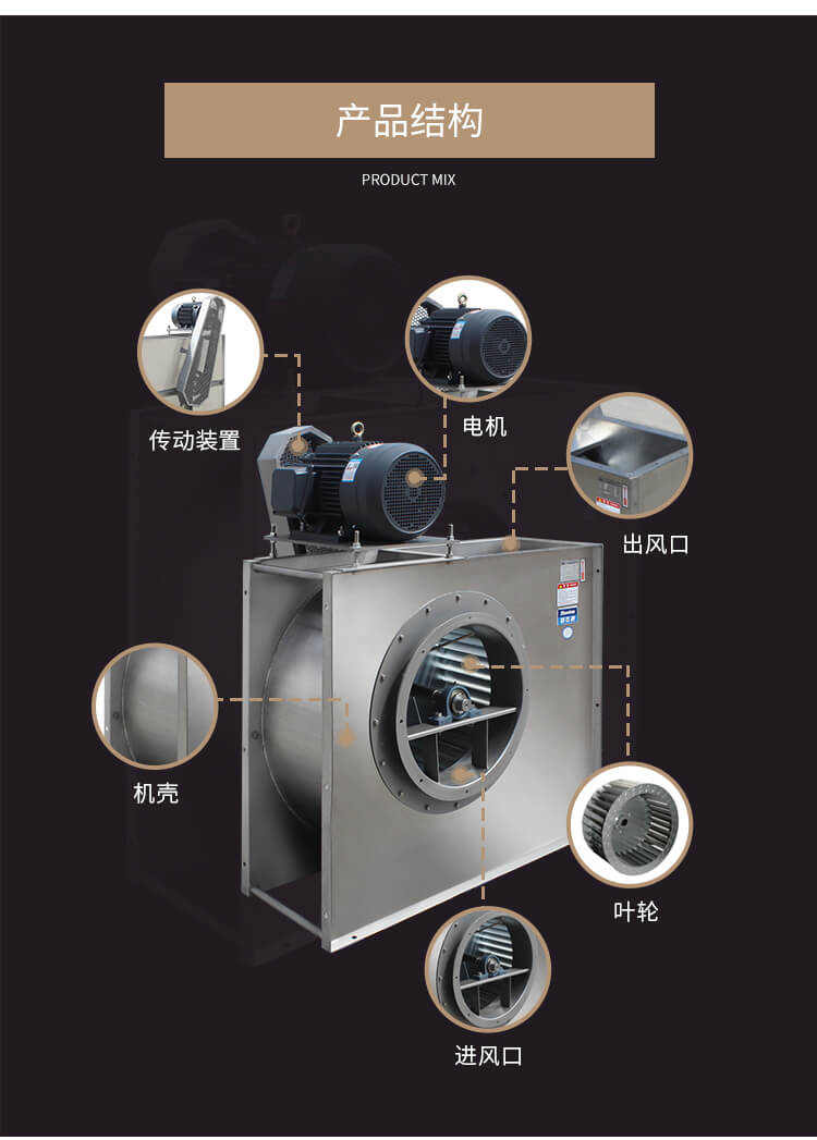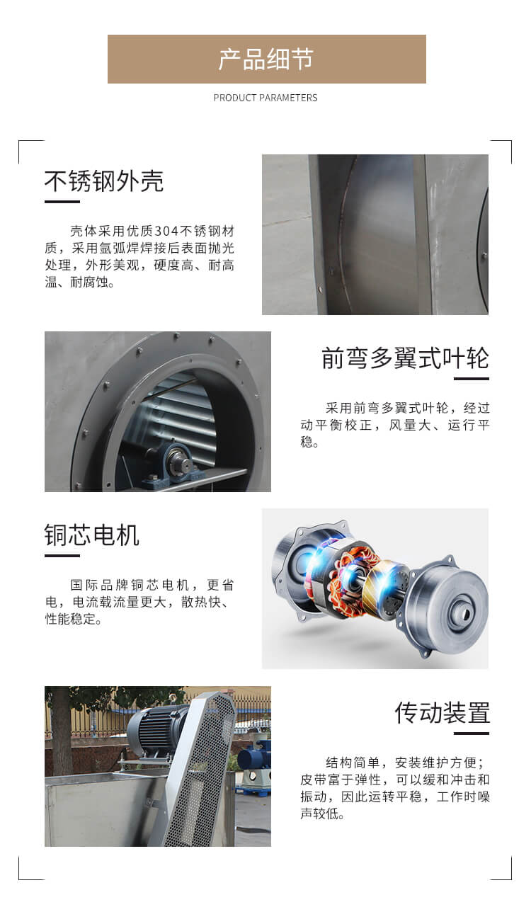 本產(chǎn)品為不銹鋼材質(zhì),具有耐腐蝕、強(qiáng)度高、大風(fēng)量、效率高、安裝方便、經(jīng)久耐用等優(yōu)點(diǎn)。前彎多翼風(fēng)輪,良好的啟動(dòng)性能;可根據(jù)需求定制成電機(jī)直聯(lián)式或皮帶傳動(dòng)式,轉(zhuǎn)速、出風(fēng)角度均可調(diào)節(jié),特殊環(huán)境可定制成防爆等級(jí)。根據(jù)客戶具體參數(shù)進(jìn)行量身定制。非標(biāo)定制,國標(biāo)型號(hào)均可生產(chǎn)。