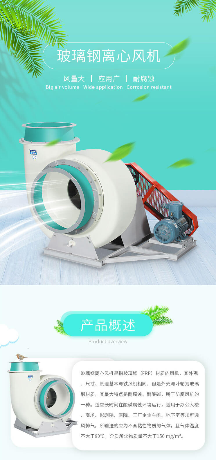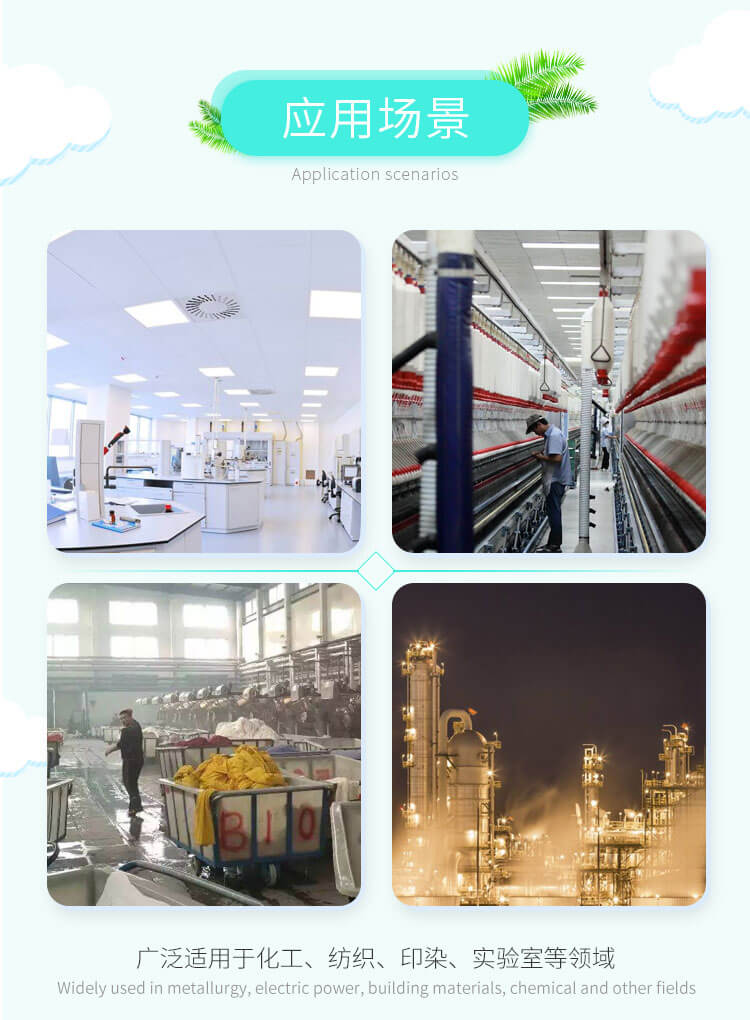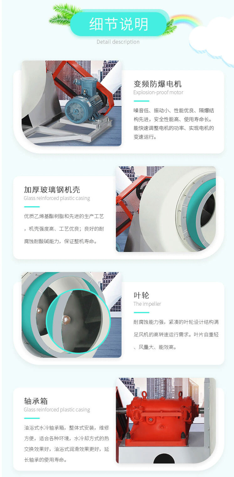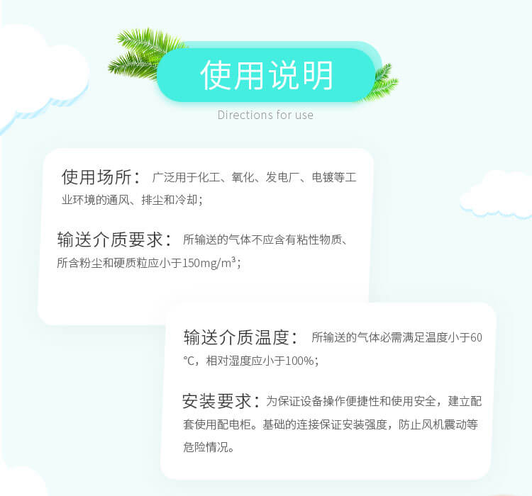 用于化工廠、紡織、電鍍、實(shí)驗(yàn)室等場所排送含有一定濃度的酸、堿、鹽等腐蝕性氣體,也可以作為一般工廠的建筑物通風(fēng)換氣用
