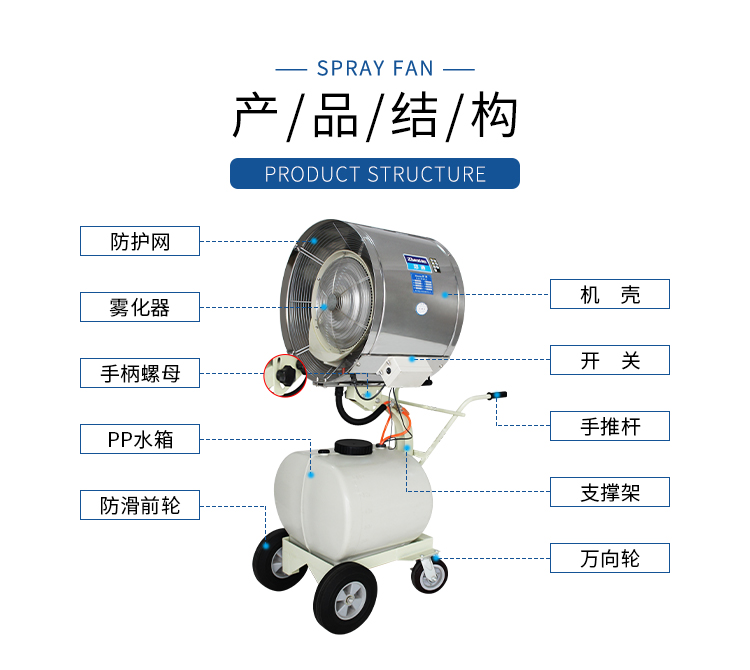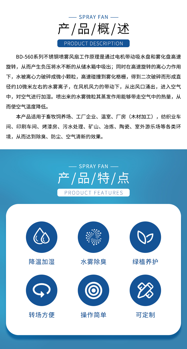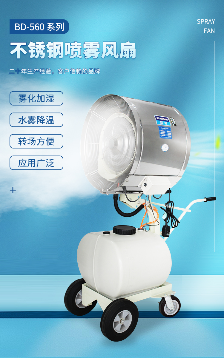 BD-560系列不銹鋼噴霧風扇工作原理是通過電機帶動吸水盤和霧化盤高速旋轉(zhuǎn),從而產(chǎn)生負壓將水不斷的從儲水箱中吸出;同時在高速旋轉(zhuǎn)的離心力作用下,水被離心力破碎成微小顆粒,高速碰撞到霧化格柵,得到二次破碎而形成直徑約10微米左右的水霧離子,在風機風力的帶動下,從出風口涌出,進入空氣中,對空氣進行加濕。噴出來的水霧微粒其蒸發(fā)作用能夠帶走空氣中的熱量,從而使空氣溫度降低。