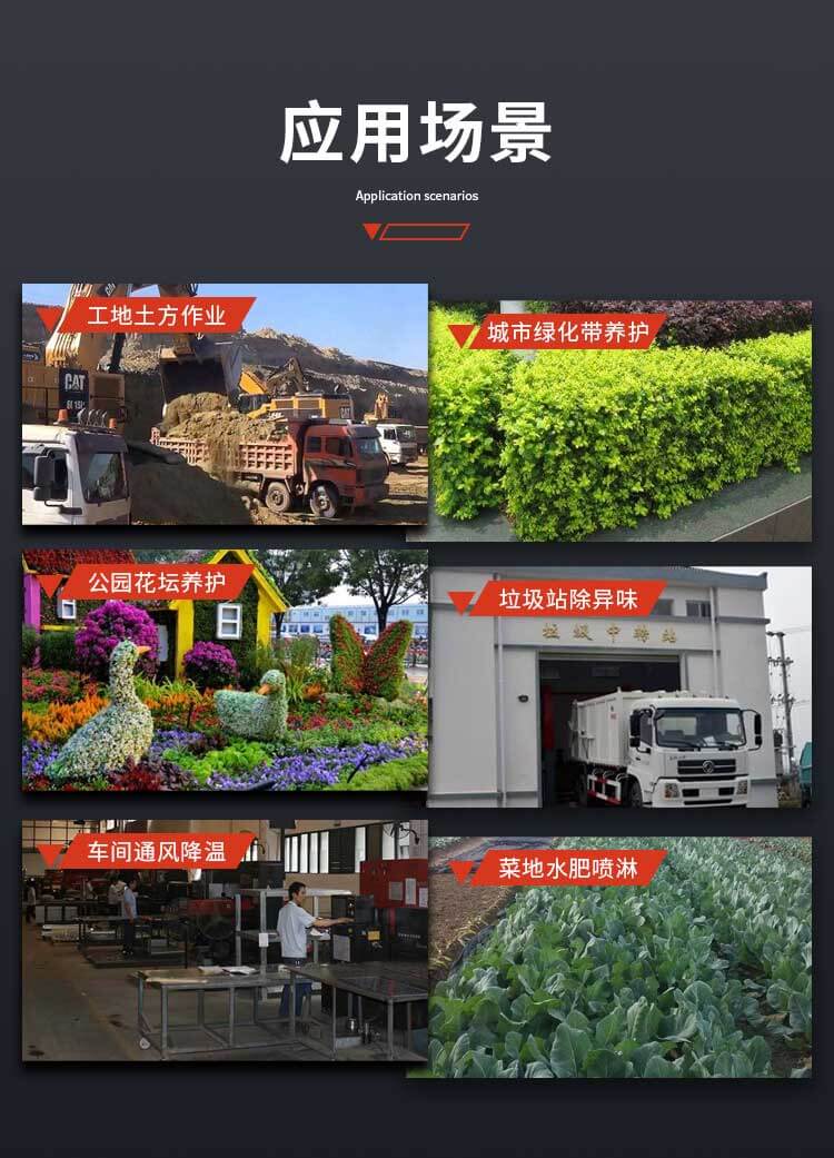 應(yīng)用于多種場(chǎng)合,如車間通風(fēng)降溫、植被養(yǎng)護(hù)澆水加濕、垃圾站除異味、植物作物水肥藥物噴淋等。