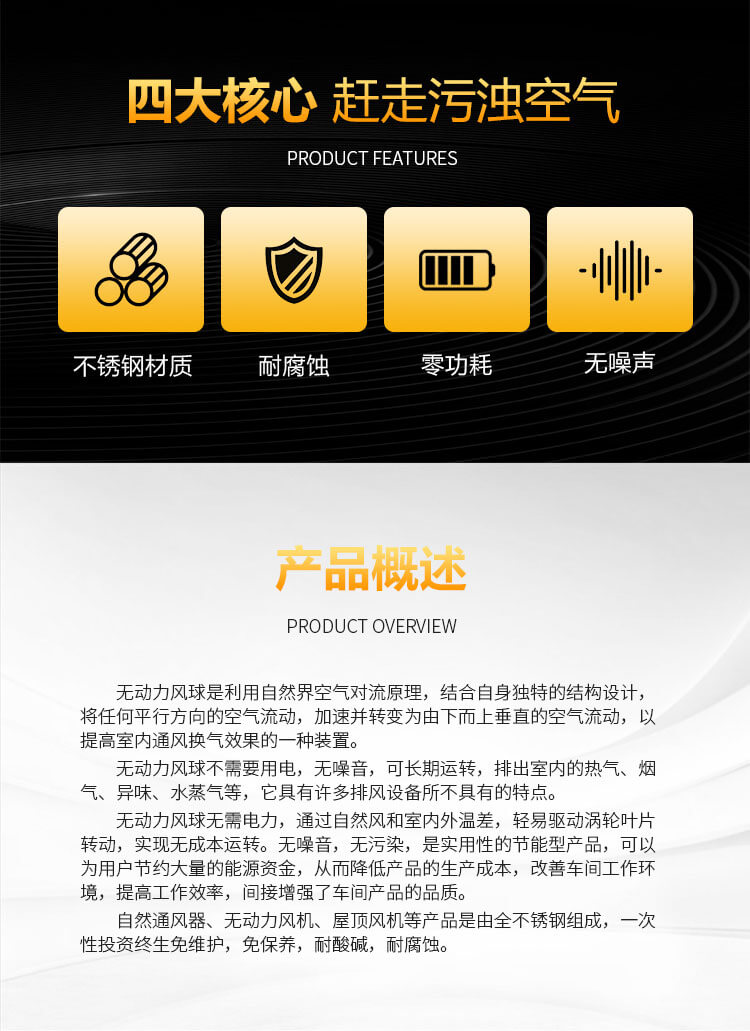 不銹鋼無(wú)動(dòng)力風(fēng)球是利用自然風(fēng)力或室內(nèi)外溫差是指運(yùn)轉(zhuǎn),能將廠房車間內(nèi)的熱氣、廢氣、油煙、粉塵等有害氣體排出,表面經(jīng)電化處理,耐氧化,耐腐蝕,使用壽命長(zhǎng),免電力、免維修、無(wú)噪聲、堅(jiān)固耐用,防結(jié)露、防雨水。