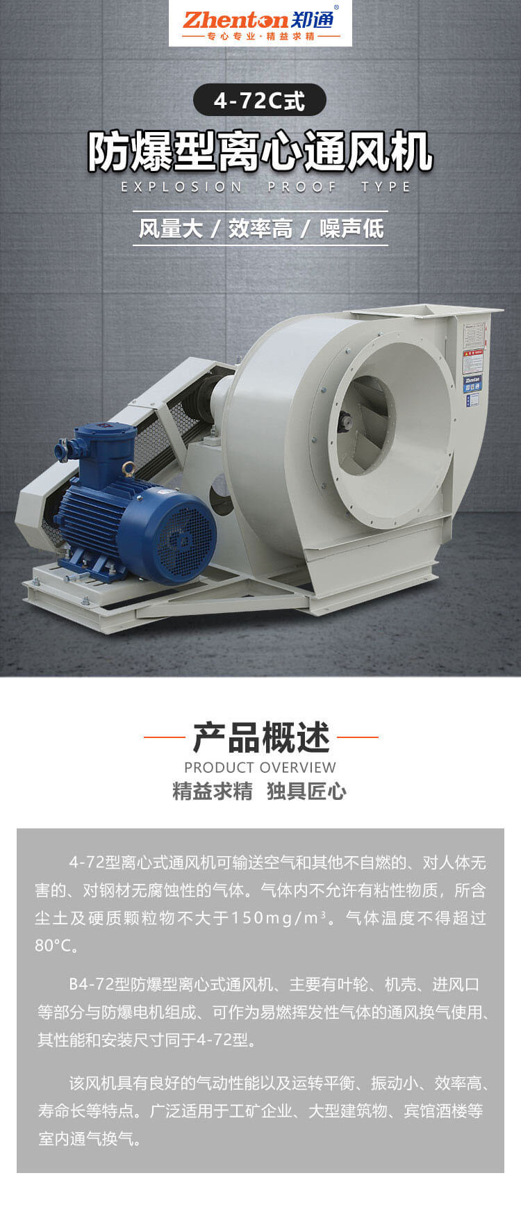 4-72型離心式通風(fēng)機(jī)可輸送空氣和其他不自燃的、對(duì)人體無(wú) 害的、對(duì)鋼材無(wú)腐蝕性的氣體。氣體內(nèi)不允許有粘性物質(zhì),所含 塵土及硬質(zhì)顆粒物不大于150mg/m3。氣體溫度不得超過(guò) 80°C。B4-72型防爆型離心式通風(fēng)機(jī)、主要有葉輪、機(jī)殼、進(jìn)風(fēng)口 等部分與防爆電機(jī)組成、可作為易燃揮發(fā)性氣體的通風(fēng)換氣使用、 其性能和安裝尺寸同于4-72型。