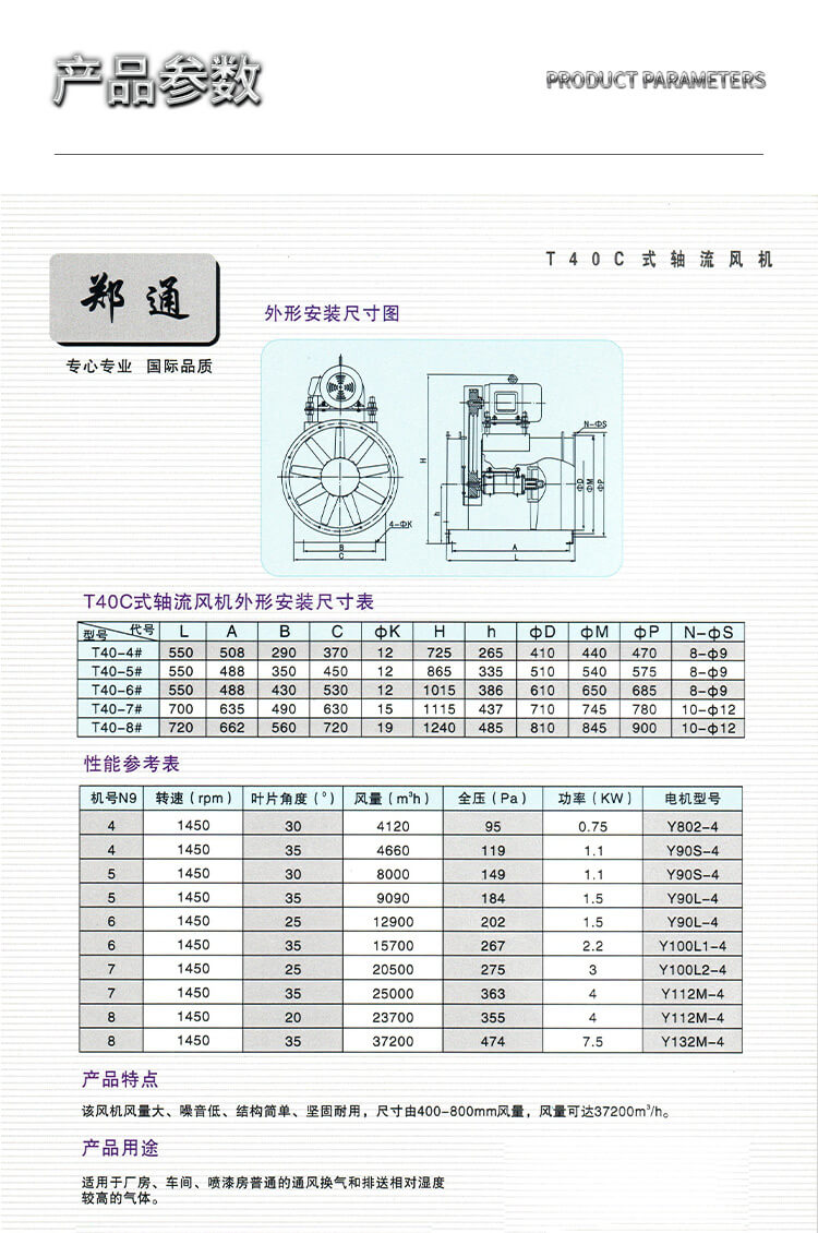 T40C式軸流風(fēng)機(jī)翼型鋁合金壓鑄葉片、性能優(yōu)良、造型美觀,可用于排送相對(duì)濕度較大、溫度較高的氣體